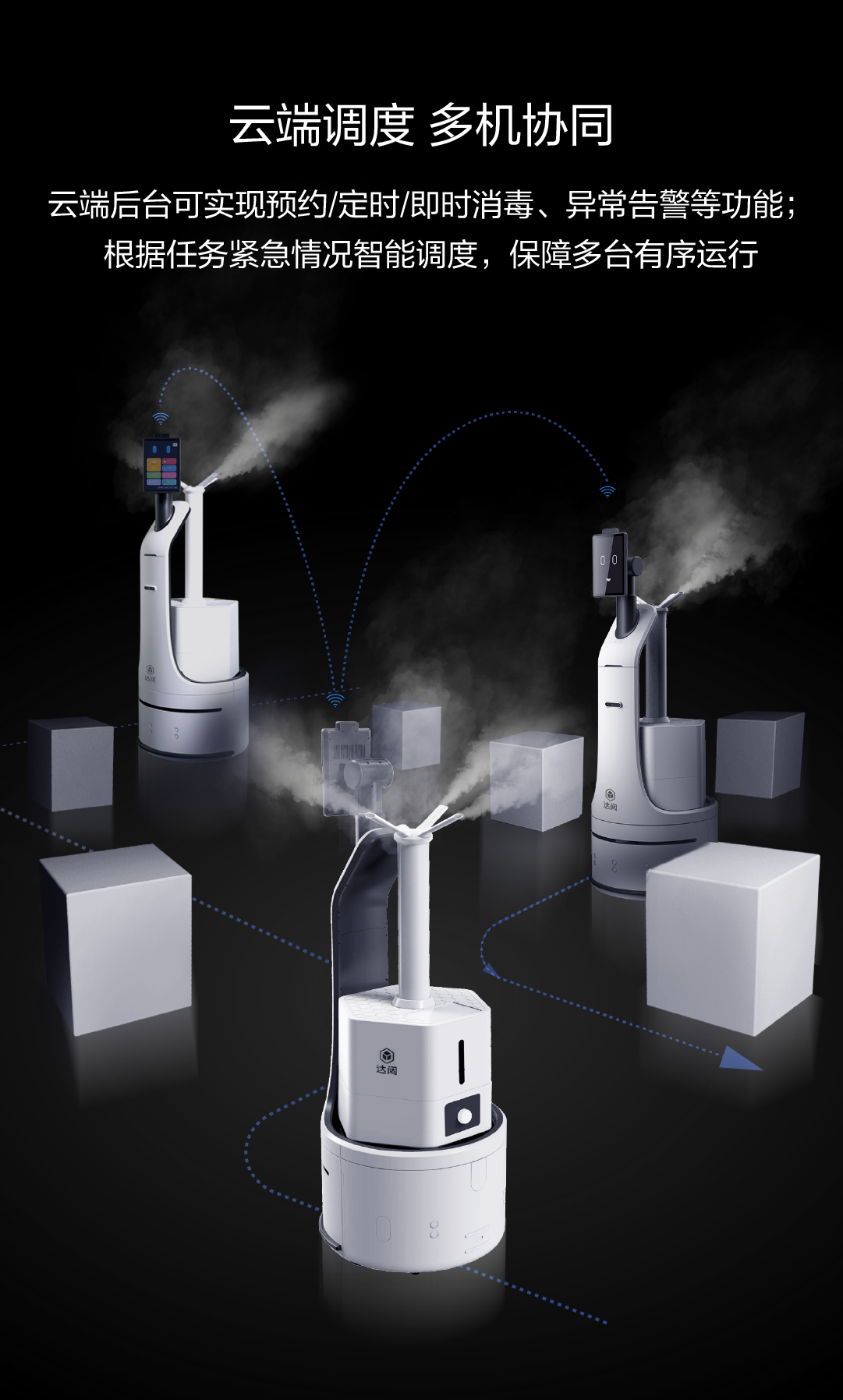 云端后台可实现预约/定时/即时消毒、异常告警等功能;根据任务紧急情况智能调度,保障多台有序运行