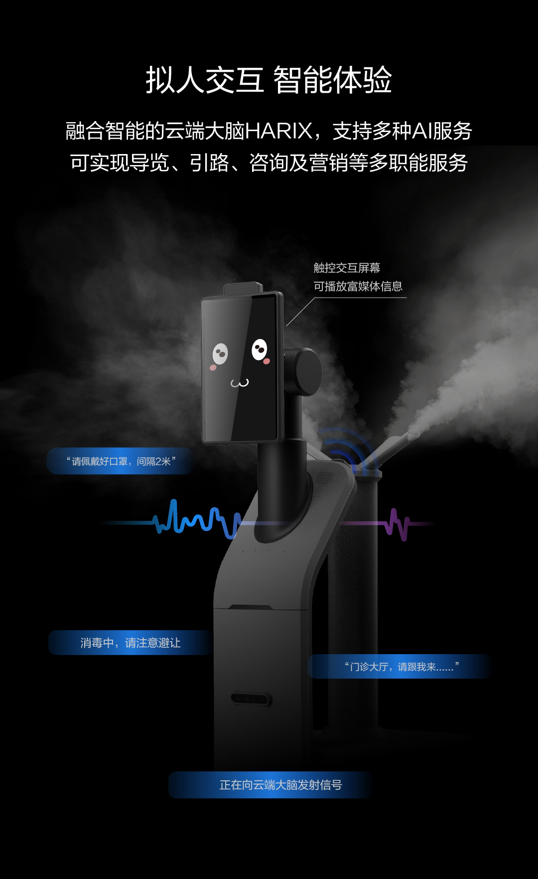 融合智能的云端大脑HARIX支持多种AI服务,可实现导览、引路、咨询及营销等多职能服务